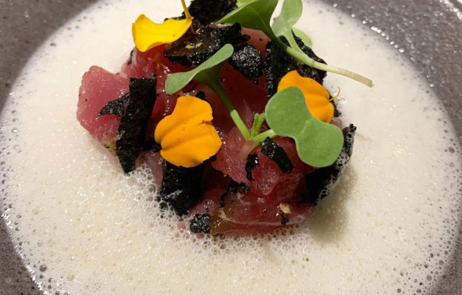 Na sequência, entraram em cena os, por assim dizer, pratos principais. Começamos com peixe do dia - confesso que esperava algo mais local, mas a neutralidade do atum caiu bem -, crispy de arroz, para dar crocância ao prato, e espuma de lambreta, feita a partir de um marisco pequenino que é um sucesso absoluto nos melhores botecos baianos. A nova roupagem traz uma textura que envolve os demais ingredientes do prato com suavidade, mas sem deixar de brilhar.