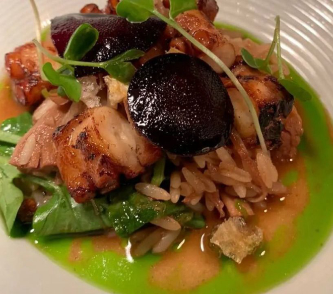 Na linha do surf and turf, presente na maioria dos restaurantes que apostam no menu degustação,teve arroz suíno com polvo, a porção crocante única do torresmo bem elaborado e agrião na versão líquida e verdejante, com aquela picância bem típica da verdura, para dar o contraponto de equilíbrio necessário ao prato com tanta força, que é a cara do sertanejo.