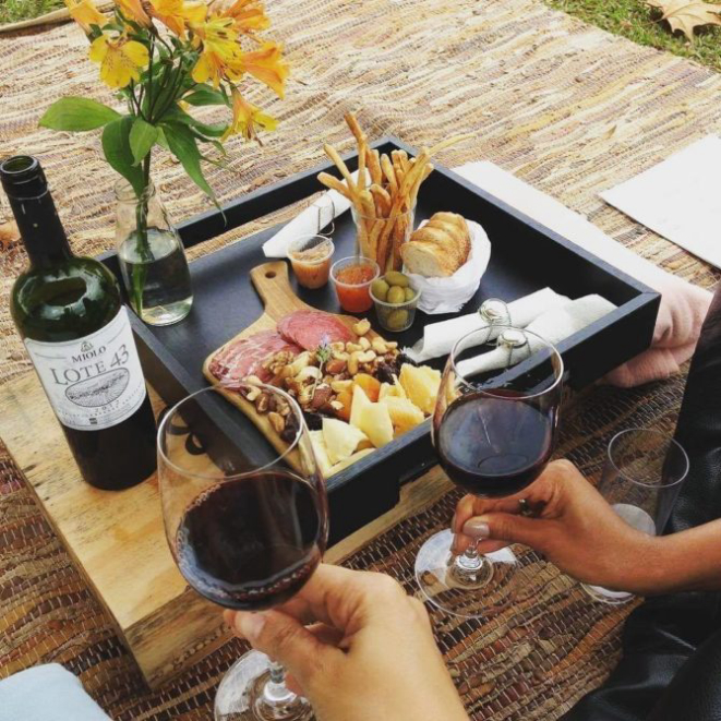 Para isso, além de se esquentar com os vinhos da maior exportadora brasileira, o visitante tem ainda à disposição tapetes, pallets, almofadas, mantinhas, mesas, cadeiras, ombrelones, e um cardápio de entradinhas como brusquetas, quiches, sanduíches especiais, além das tábuas de frutas, queijos e charcutaria (a maior parte dos itens do menu é elaborado com matéria-prima da horta orgânica do Wine Garden). Tudo, claro, para que as pessoas se sintam acolhidas e para harmonizar com os vinhos e espumantes da Miolo (consulte a disponibilidade de alguns rótulos vendidos em taça). E, de preferência, curtir bem acompanhado. Atenção a um detalhe: nos dias mais gelados, os turistas podem curtir o frio degustando um vinho ao redor de uma fogueira!