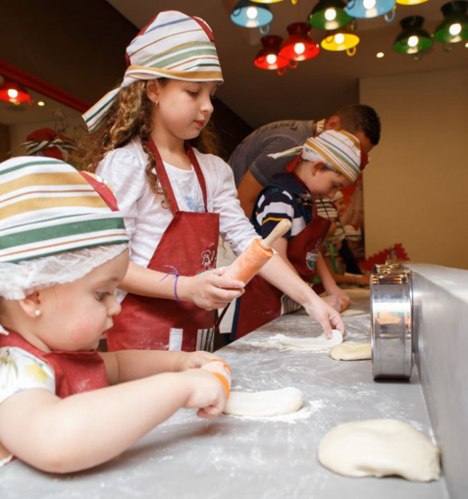 Para preparar as pizzas, as crianças vestem avental e bandana e podem preparar até duas pizzas tamanho brotinho e bebida à vontade (suco, refrigerante e água). Junto ao espaço para as crianças prepararem pizzas, há uma sala com televisão, som, livros, brinquedos e bolas. Durante o funcionamento do espaço, recreadores animam as crianças com gincanas e brincadeiras.