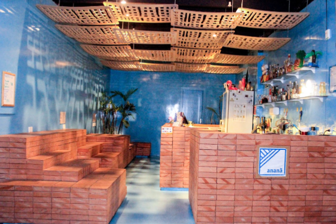 Inspirado no movimento de bares tiki dos anos 1940, o Ananã mescla o pensamento tropical, regional e artesanal, tanto na decoração quanto no cardápio. A ambientação tiki geralmente traz referências à cultura do exótico polinésio, mas no caso do Ananã, a ideia foi traduzida para o Brasil: na decoração, exalta-se o exótico brasileiro. Placas de compensado penduradas sob spots no teto permitem que a luz crie texturas de sombra nas paredes e também nos clientes. Com esse artifício, a sensação de quem frequenta o local é a de estar vestindo a mesma roupa do desconhecido que está ao seu lado, como se todos pertencessem à mesma “tribo”. No lugar de bancos e mesas, arquibancadas de tijolos de barro produzidos em uma indústria paranaense convidam os presentes à descontração. Dos tijolos da arquibancada até os balcões de inox de uso interno, todos os elementos do bar foram feitos sob medida. As paredes são em azul vinil, com algumas plantas ao fundo, criando um contraponto entre o quente e frio, plástico e rugoso, orgânico e artificial — alguns dos artifícios que consagraram o ambiente como vencedor na categoria.