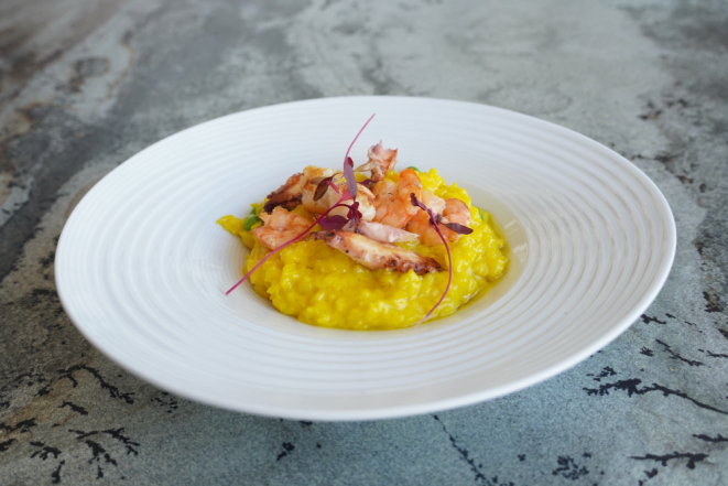 O prato principal consiste em risoto de frutos do mar com camarão, vieira, polvo, ervilha e caldo de frutos do mar com açafrão espanhol.