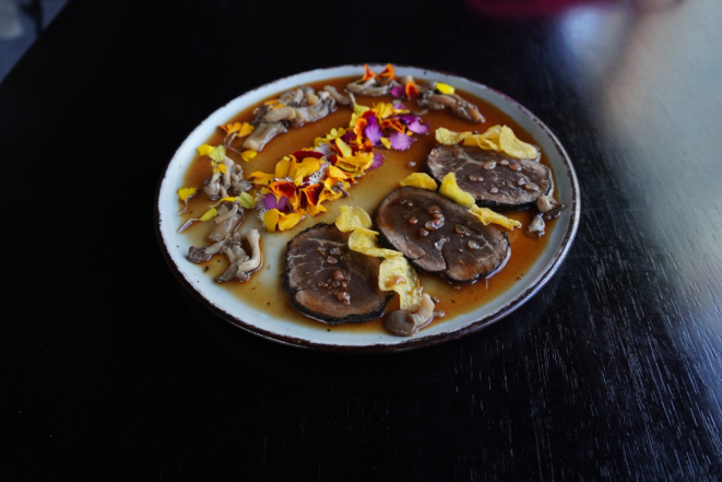 A entrada, o Tiradito de Mignon, resgata o peruano nikkei (com influência asiática) e consiste em fatias de filet mignon marinadas em chipotle cítrico e shoyu, servidas com shimeji e chips de batata salsa.