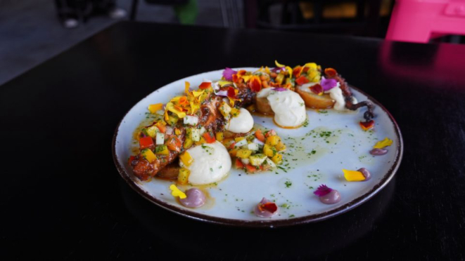 O prato principal trata-se de polvo marinado em anticuchera peruana, grelhado, servido com purê de couve flor com coco, salsa de azeitonas pretas, batata e chimichurri.