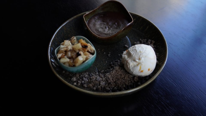 Para finalizar, um pudim de chocolate 70% assado com toque de chili de sobremesa. Ele é servido com cubos de abacaxi grelhado e sorvete de mascarpone com tangerina.