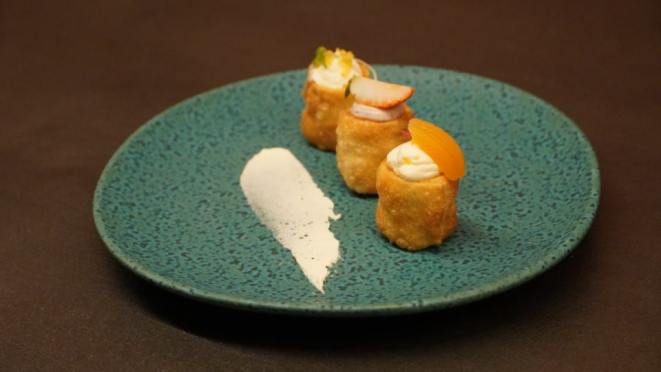 Já a sobremesa consiste em Canoli de frutas, uma massa crocante recheada com creme de ricota de frutas vermelhas, damasco e flor de laranjeira e limão siciliano.