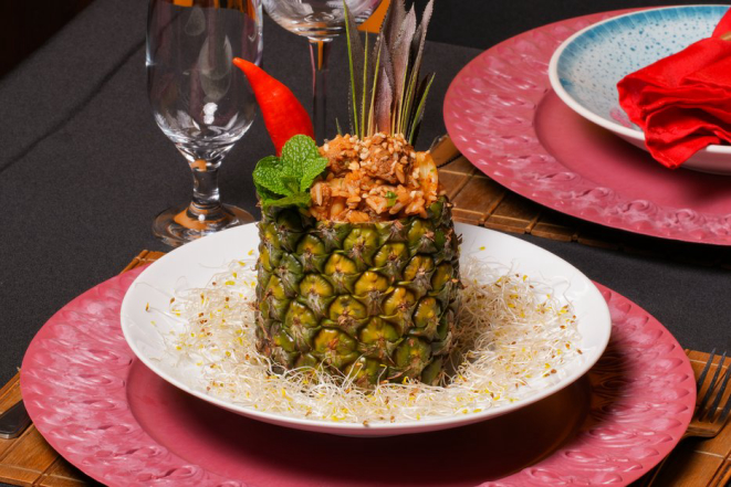 Camarão tropical no abacaxi, disponível no menu do estabelecimento Ilhas de Jurerê. Crédito: Natasha Azambuja.