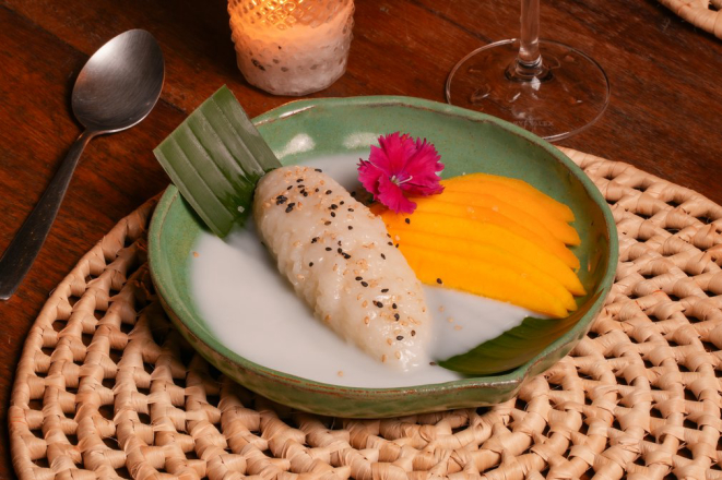 Mini Mango Sticky Rice, disponível no menu do estabelecimento May Campeche e Santo Antônio. Crédito: Agência Vulgata
