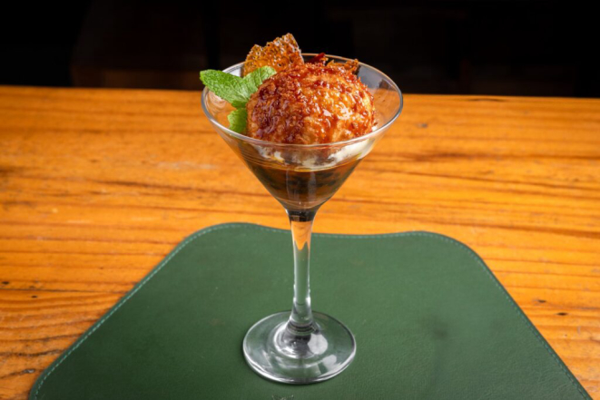 A segunda opção da casa é o Sorvete de Tahine com Pistache e Mel, um sorvete artesanal de tahine (feito de gergelim), com notas de gergelim tostado, finalizado com crocante de pistaches e um fio de mel. A sobremesa traz o sabor marcante do gergelim, equilibrado pela doçura do mel e a crocância dos pistaches.