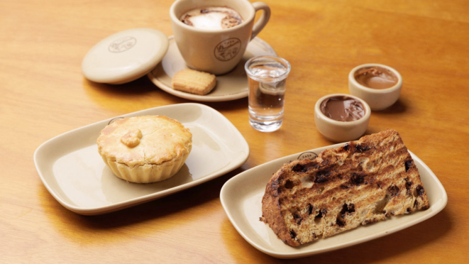 Capuccino (150 ml), torta de frango e fatia de Chocottone Clássico. Acompanha uma porção de Nutella e uma porção de doce de leite.