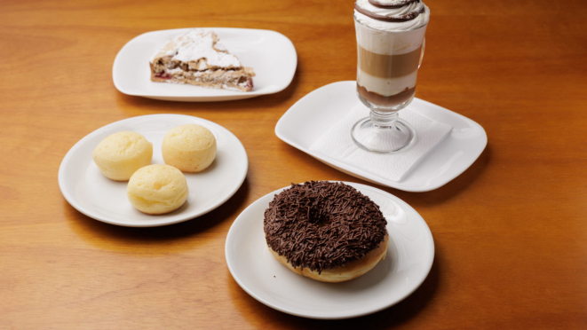 Mocha de Ninho com Nutella (240 ml), três pães de queijo, torta de coco com nozes e framboesa e donuts de brigadeiro.