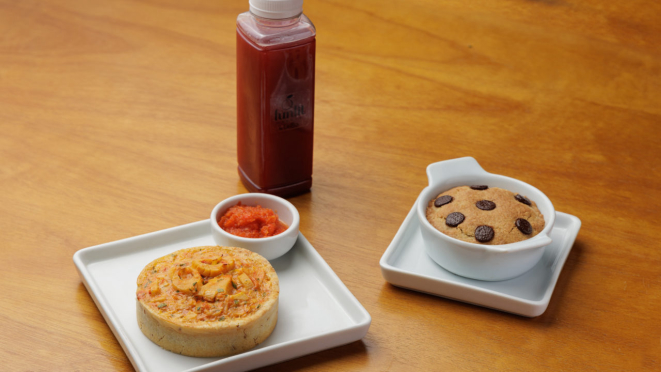 Suco prensado a frio (morango, beterraba, maçã e limão), quiche de palmito (acompanha molho de pimenta-dedo-de-moça, pimentão e cebola) e cookie funcional de baunilha recheado com brigadeiro belga 70% cacau.