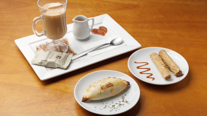 Dulce de leche quente (bebida quente à base de leite e dulce de leche com canela polvilhada; acompanha espresso), empanada de carne, mini alfajor recheado de dulce de leche e dois Cubanitos (casquinha de waffle crocante recheada com dulce de leche).