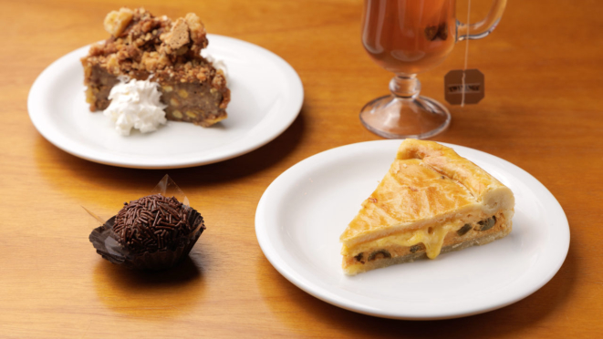 Chá quente Twinings (240 ml), quiche de frango, torta de maçã com especiarias e brigadeiro.