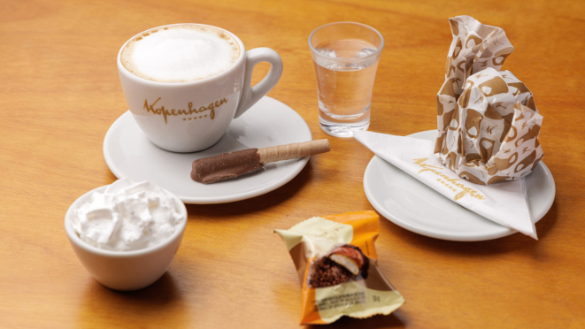 Capuccino (150 ml), servido acompanhado de chantilly e petit waffer, Nhá Benta Tradicional (40 g), Melt (30 g) e cookie sabor baunilha recheado com caramelo coberto com chocolate ao leite e decorado com chocolate ao leite em flocos.