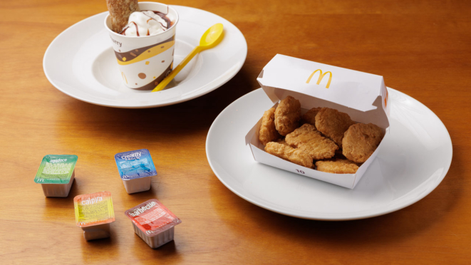 Chicken McNuggets (10 unidades de frangos empanados crocantes) acompanhados por quatro molhos (caipira, agridoce, barbecue e creamy ranch) e Caldo & Freddo (massa gelada de baunilha, tortinha de banana e calda de chocolate).