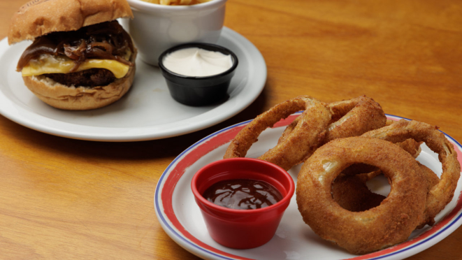 Onion Rings (6 unidades de anéis de cebola à milanesa) acompanhados de molho barbecue e HB Jack (pão com fermentação natural, hambúrguer de 150g de Short Ribs preparado com whisky, queijo prato, cebola caramelizada e maionese especial Mustang Sally). Acompanha batata frita.