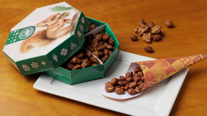 Caixa oitavada com mix glaceado (400 g, com amêndoas, amendoins, castanhas-de-caju, macadâmias e nozes glaceados) e cone de amendoim glaceado (70 g).