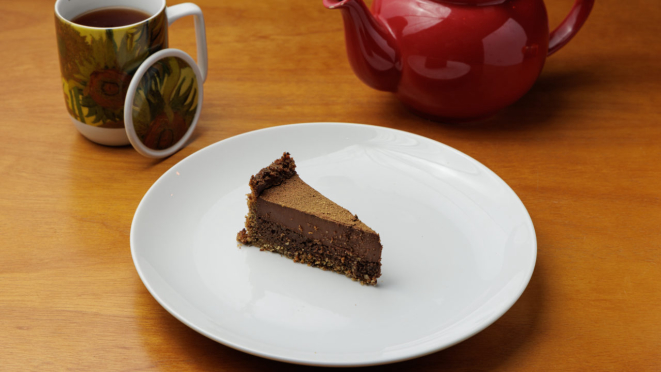 Chá Rooibos Gracia Blend (350 ml), com baunilha, laranja, rosas, marianinha e girassol, e Golden Cake (bolo de chocolate belga, farinha de amêndoas e infusão Golden Cake).