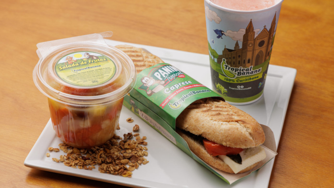 Sapo-Cururu (suco de laranja, morango e abacaxi), panini Caprese (sanduíche no pão baguete, queijo branco fresco, tomate, molho pesto e manjericão fresco) e salada de frutas com frutas frescas da estação. Acompanha granola.