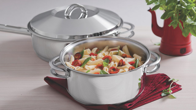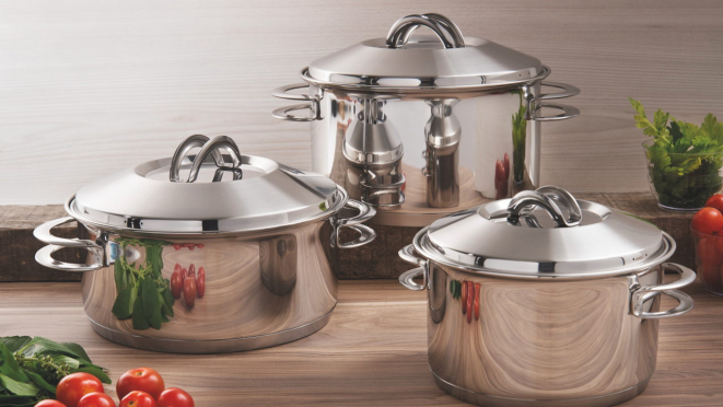 panelas de inox da Tramontina, foram incluídos cabos e alças de baquelite e
