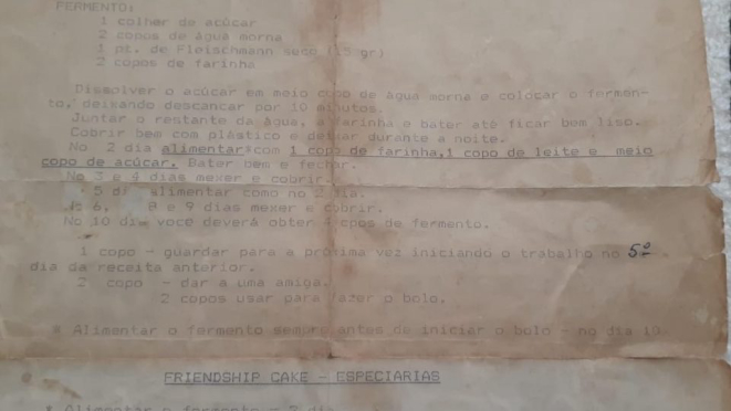 Desde então, passa a tradição adiante ao presentar amigas e parentes com o bolo e o fermento, e ao acrescentar toques pessoais à receita. “Tão ou mais legal do que fazer o bolo da amizade, que tem um processo mais demorado por causa do fermento, é dar de presente aos amigos junto com o bolo um pouquinho do fermento. Essa é a ideia do bolo, que seja uma maneira de reforçar laços de amizade com algo saboroso, e que pode ser compartilhado muitas vezes”, conta.