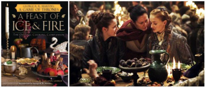 No último domingo (24) os órfãos da série Game Of Thrones mataram a saudade das batalhas pelo Trono de Ferro de Westeros com o primeiro episódio da sexta temporada. Além das traições, artimanhas e disputas que se passam no mundo de fantasia criado por George R.R Martin, os banquetes desfrutados pelos personagens chamaram tanto a atenção que foi escrito um livro que compila 150 receitas dos pratos exibidos na série. Entre as excentricidades estão a torta de pombo e a carne de codorna. Há também a truta envolta em bacon, sopa de alho-poró, frango ao mel, cebola grelhada com molho, costela de carneiro e a torta de carne de porco.