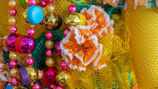 Para as instalações, as pesquisas de Krelling começaram em abril e ganharam forma a partir do uso de alimentos, embalagens e utensílios de cozinha, em partes comprados e em partes coletados com a ajuda da vizinhança. Assistente de Gustavo e responsável por parte da confecção das peças, Glaci de Jesus fez um mutirão em seu condomínio para angariar boa parte do material usado na exposição, como embalagens plásticas de iogurte, refrigerantes, latas e papéis plastificados. Resíduo industrial têxtil e de acessórios figuram em meio ao reaproveitamento de sacas de juta, caixas de feira e redes plásticas.