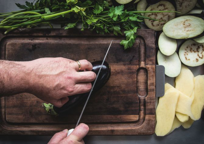 Enquanto o molho à bolonhesa cozinha, descasque as batatas. As berinjelas devem ser preparadas com a casca.