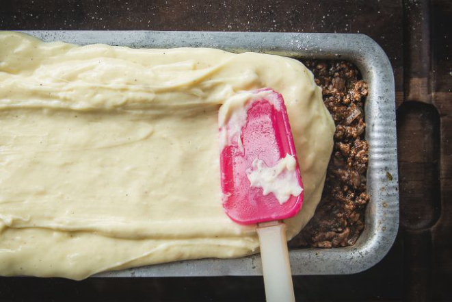 Coloque uma camada de batata no refratário e salgue-a generosamente. A seguir, adicione camadas de berinjela. Cubra tudo com o molho de carne.