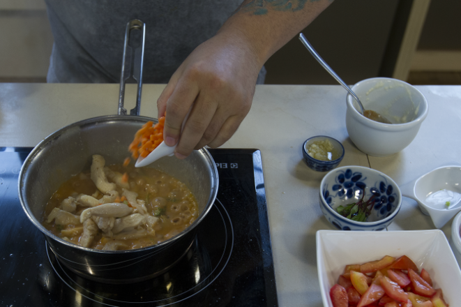 5 – Coloque o tomate, a cenoura, a cebolinha e o coentro.
