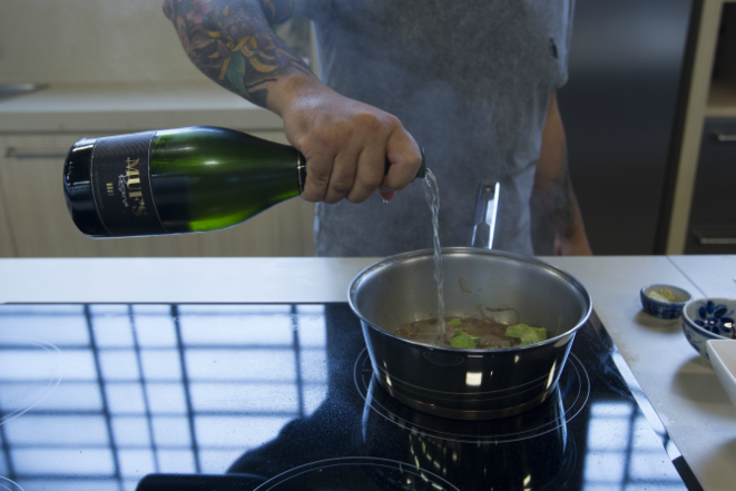 3 – Coloque o espumante e deixe reduzir até 1/3.