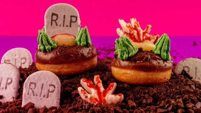 A franquia curitibana especializada em donuts também incluiu opções temáticas de Dia das Bruxas em seu cardápio, válidas até o dia 31 de outubro. O donut Cemitério Açucarado (recheio de brigadeiro branco e geleia de morango, com cobertura de chocolate preto e Oreo) tem decoração de lápide, com uma mãozinha de chocolate saindo da “terra”, igual aos filmes de terror.