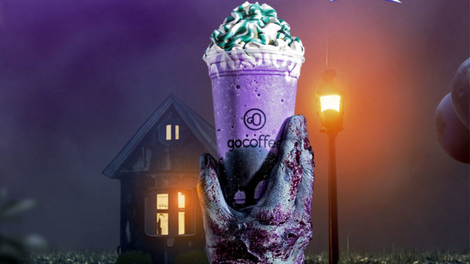 Para o Dia das Bruxas, a rede de cafés Go Coffee relançou o Frappe Secreto de Halloween, mantendo o sabor de uva, mas com uma apresentação “mais arrepiante”.