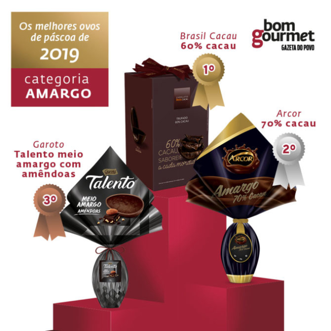 Com textura cremosa, o Talento Meio Amargo com Amêndoas, da Garoto, ficou na terceira posição. Chocolate foi considerado “adocicado” pelos jurados, apesar de estar classificado como meio amargo. Média de preço: R$ 45 (350 g).