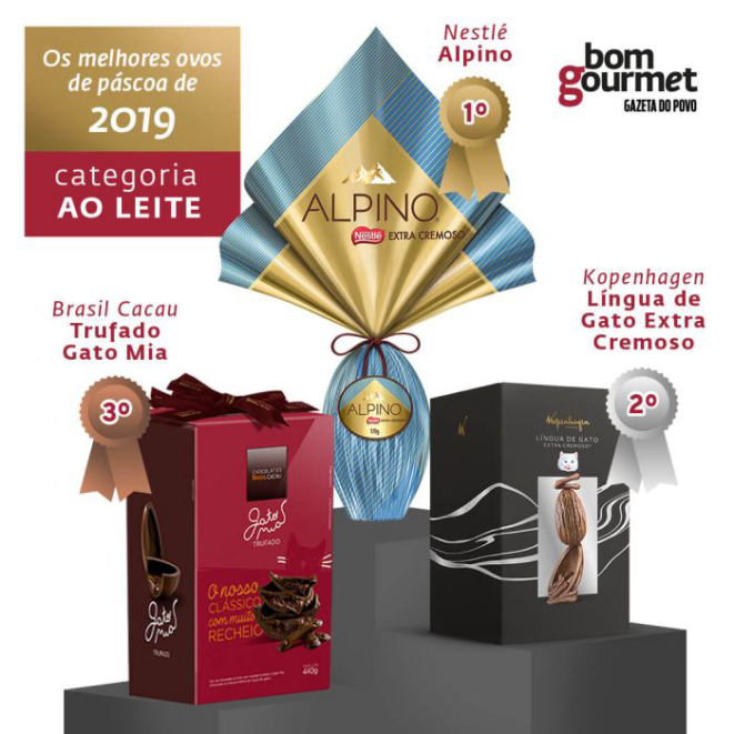O Alpino Extra Cremoso, da Nestlé, levou o título de melhor ovo de chocolate ao leite. Foi avaliado com aparência bonita, clara e com bom brilho, além do sabor doce e com presença marcante de leite. Sua textura pastosa, escreveu um dos avaliadores, contribui para que o produto demore para derreter na boca. Média de preço: R$ 35 (170 g).