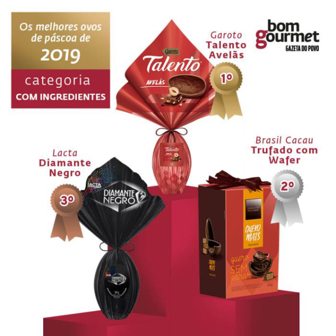 A combinação da avelã com o chocolate ao leite levou o Talento Avelãs, da Garoto, ao posto de campeão da categoria “com ingredientes”. Os jurados elogiaram a aparência e o brilho do ovo, além da presença marcante das oleaginosas. “Crocância agradável e sabor bom, destacado pelas avelãs”. Média de preço: R$59 (290 g).