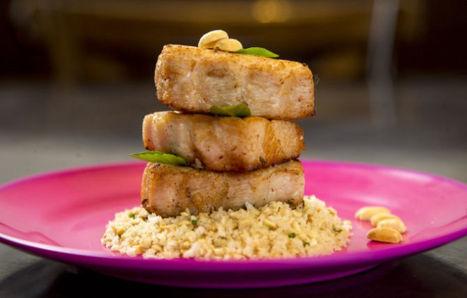 “Pirarucu marinado com iogurte e farofa de amendoim. O amendoim dá um toque oriental ao peixe, especialmente quando combinado a outras especiarias, como a canela e o gengibre. Nessa receita, o amendoim está na farofa, aumentando a crocância e o contraste com a maciez do pirarucu”.