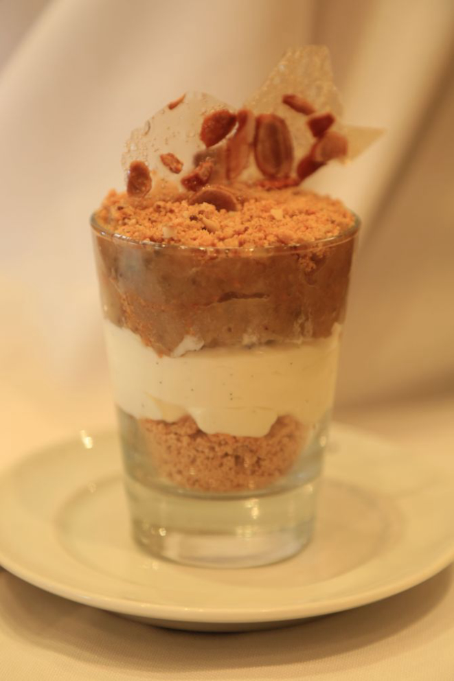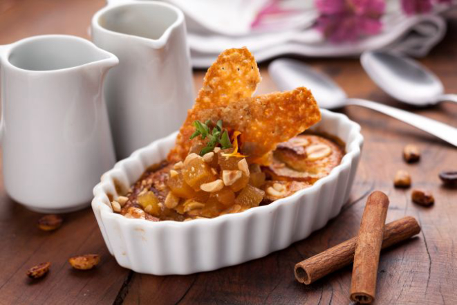 “Clafoutis de maçã e canela com creme cappuccino de amendoim. Clafoutis é uma preparação clássica e superversátil. Gosto muito de amendoim com maçã, canela, chocolate e café. A crocância do amendoim pede uma sobremesa cremosa e macia, por isso, o clafoutis com o creme cappuccino de amendoim se torna uma combinação perfeita! Além disso, bem quentinha para ser servida nos dias frios.”