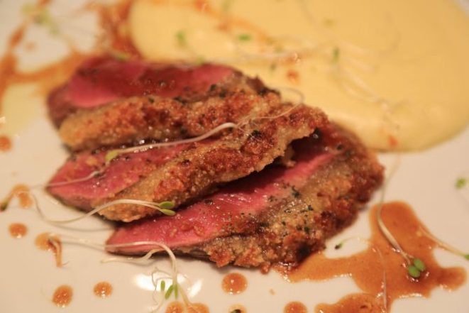 “Lombo de cordeiro em crosta de amendoim com purê de batatas na manteiga e ervas. Já executei essa receita com crosta de pistache e gostei muito da possibilidade de substituição pelo amendoim. A guarnição, com o molho de ervas, também foi pensada para equilibrar o sabor do ingrediente-chave. Acho que essa receita tem a proporção exata das bases da minha cozinha francesa e italiana”.