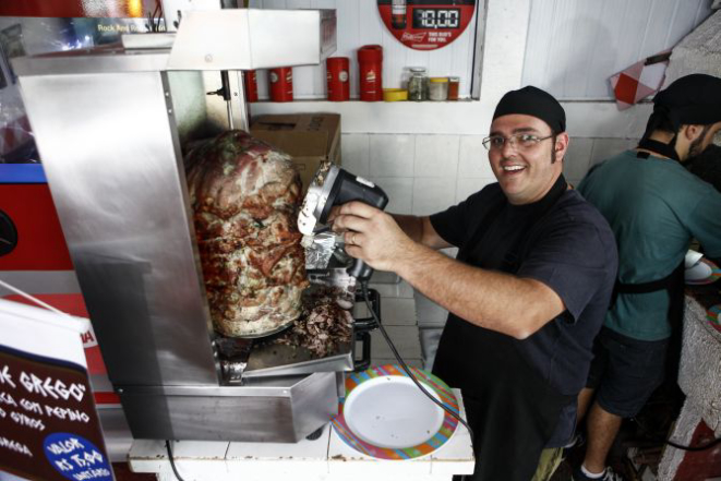 Ele usa a sobrepaleta suína, mesmo corte usado na Grécia, temperada com sal, pimenta-do-reino e orégano. A carne fica assando por horas no espeto giratório e as primeiras tiras ficam prontas após cerca de 45 minutos. No recheio vai também tomate, cebola, alho, fritas e molho à escolha: o tradicional tzatziki, à base de iogurte (que também é preparado pelo próprio chef), ou skornaliá, molho de alho.