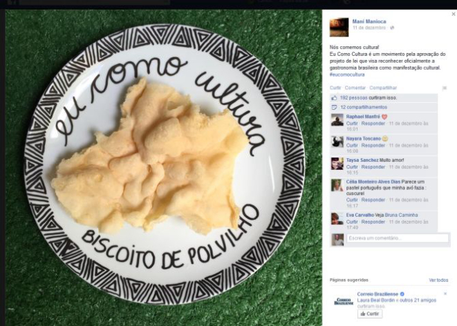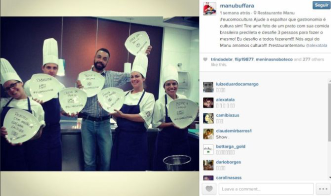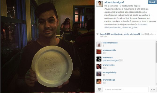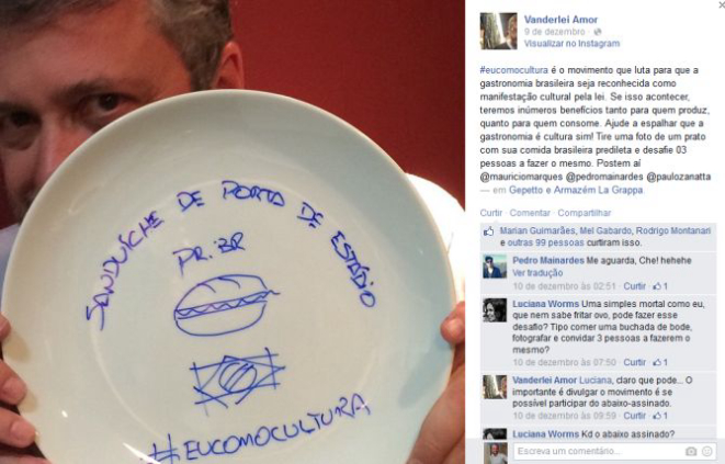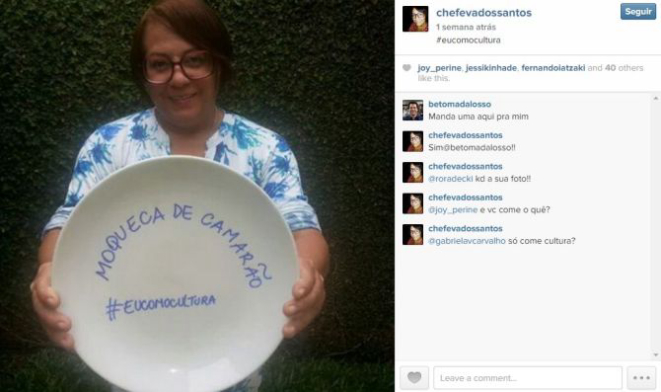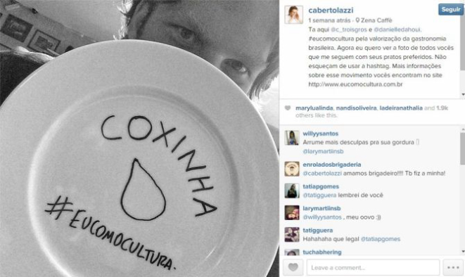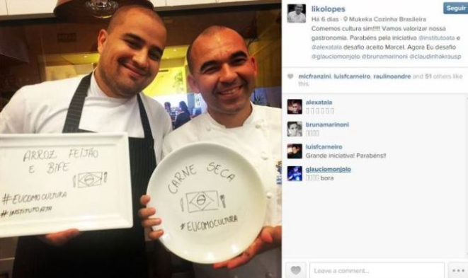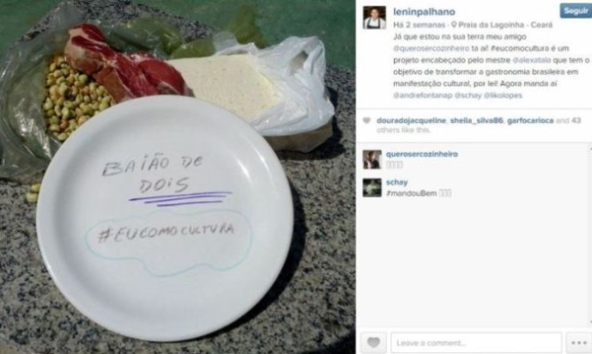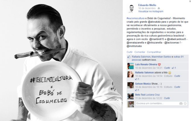 A campanha #eucomocultura, lançada no início do mês pelo Instituto ATÁ, do chef Alex Atala, está movimentando as redes sociais. Vários chefs já demonstraram apoio à ideia de incluir a gastronomia na Lei Rouanet — o que proporcionaria incentivos fiscais a quem estiver ao lado de projetos relacionados à área. O objetivo de Atala é recolher um milhão de assinaturas em um documento virtual disponível no site oficial da ação. Ele deverá ser preenchido, impresso e enviado para caixa postal do Instituto ATÁ, nº 72370, CEP 01427-970. Após isso, o chef enviará estas assinaturas ao Congresso, para pressionar os parlamentares a incluir a mudança no atual texto da lei. Para divulgar, o Alex Atala sugere que as pessoas (chefs ou não) postem sua foto no Facebook ou Instagram citando pratos que são patrimônios da gastronomia brasileira — usando a hashtag #eucomocultura. Além disso, para espalhar a notícia, cada um deve desafiar outras três pessoas a fazerem o mesmo No Paraná, profissionais como as Chefs 5 Estrelas Eva dos Santos (Bistrô do Victor) e Manu Buffara (restaurante Manu) já publicaram suas imagens. Segundo o Instituto Atá, mais de 2,5 milhões de fotos com a hashtag já foram publicadas no Facebook e 5,7 mil, no Instagram. A contagem das assinaturas só deve ser feita em fevereiro. Veja a seguir algumas das imagens: