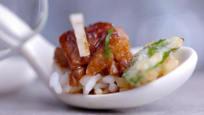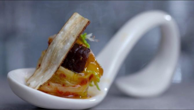 “A comida coreana é apimentada, tem acidez, o sal já vem do kimchi e é doce. Usam muito óleo de gergelim”, instruiu Claude para seus três mentorados. André deu a dica de ingredientes que poderiam ser usados: berinjela, alho, cebola, gengibre, cenoura. Ele considerou que, por ir uma vez por semana ao restaurante de Shin, seu time teria maior facilidade em acertar. Sua escolha de colher foi novamente da curitibana Fernanda Zacarias, que preparou barriga de porco adocicada enrolada na folha de shissô fresca. “Talvez tenha sido a colher mais fiel e isso possa ter ajudado a se destacar mais”, avaliou Fernanda, que foi muito elogiada pelos quatro mentores.