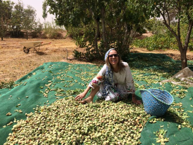 A chef Joy Perine participou da colheita de amêndoas. Foto: Divulgação.
