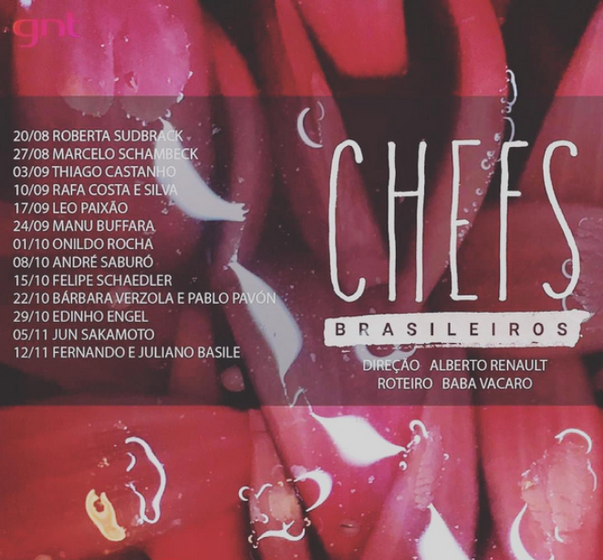 Além de Manu Buffara, o Chefs Brasileiros também vai contar as histórias do paraense Thiago Castanho (3 de setembro), do chef revelação do Rio de Janeiro, Rafa Costa e Silva (10 de setembro) e do aclamado sushiman Jun Sakamoto (5 de novembro), entre outros. Ao todo, a série tem 13 episódios, sendo que o último é veiculado em 12 de novembro, sobre os chefs Fernando e Juliano Basile.