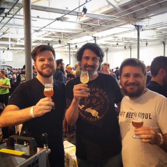 A Way Beer representou, pelo quarto ano consecutivo, o país no principal festival de cervejas especiais da Europa: o Copenhagen Beer Celebration (CBC), na Dinamarca. A cervejaria paranaense, única representante da América Latina, apresentou oito rótulos exclusivos. Na foto: Paulo Almeida, proprietário do Empório Alto dos Pinheiros, em São Paulo, entre Alejandro Winocur e Alessandro Oliveira, sócios-proprietários da Way Beer.
