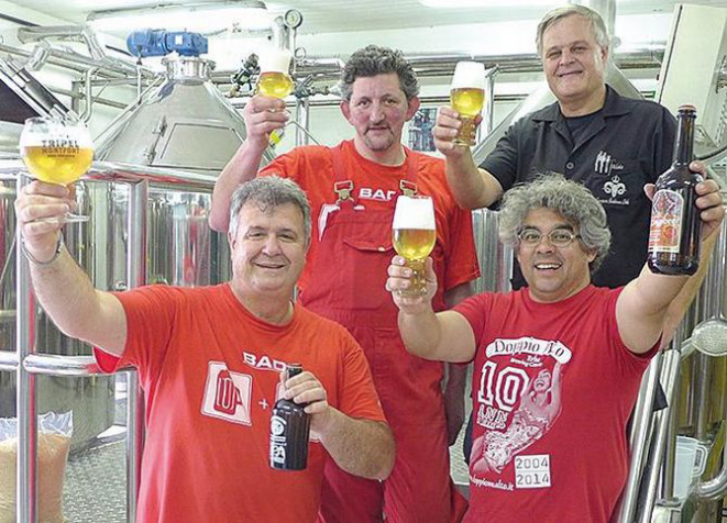 Os mestres-cervejeiros italianos Alessandro Campanini e Lia Manolo (à esq.), da Doppio Malto, passaram uma semana na Bodebrown, em Curitiba, produzindo as cervejas Summer Ipa e Zingibeer com os anfitriões Samuel Cavalcanti (de óculos) e Edigyl Pupo (de preto). Os rótulos chegam ao mercado neste mês.