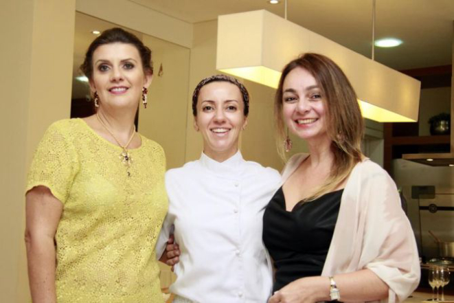 A sommelière Meriane Sander (à esq.) abriu sua residência para celebração especial do Dia da Mulher. Entre as convidadas, suas confreiras da D’Vinas, como a sommelière Sandra Ávila . O jantar foi preparado pela chef Kika Mader, do Sel et Sucre (no meio).