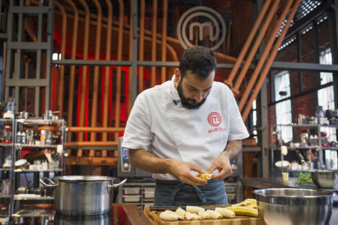 Marcelo inovou muito e serviu o baião de dois com casca de banana, farofa de banana, vinagrete de banana e banana assada com crosta de biju. Foi o que surpreendeu a todos. Recebeu sete votos dos estrangeiros, o voto do professor Ricardo e o voto dos jurados, o levando direto ao mezanino. “Escolhi a banana por ser produto que dá pra brincar com bastante técnica”, disse. O professor de gastronomia elogiou a preparação. “O seu prato é muito interessante. Você fez uma diversidade de tratamentos. Até a casca. Parabéns pelo seu prato”.