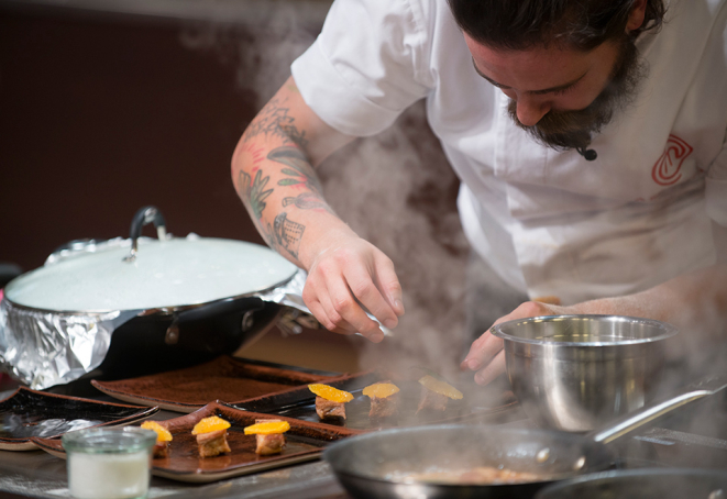 A apresentação do prato agradou a jurada Paola, que elogiou, “ele é moderno e contemporâneo”. Mas não foi suficiente. O copa lombo ao molho kimchi, com quiabo, picles de maçã verde e laranja, foi a escolha de André para trabalhar com o fermentado kimchi. Kimchi é um prato bastante popular para os coreanos, como o arroz e feijão para os brasileiros, feito principalmente de acelga mas que pode levar outras verduras. A conserva é do bem por conter muitos probióticos.